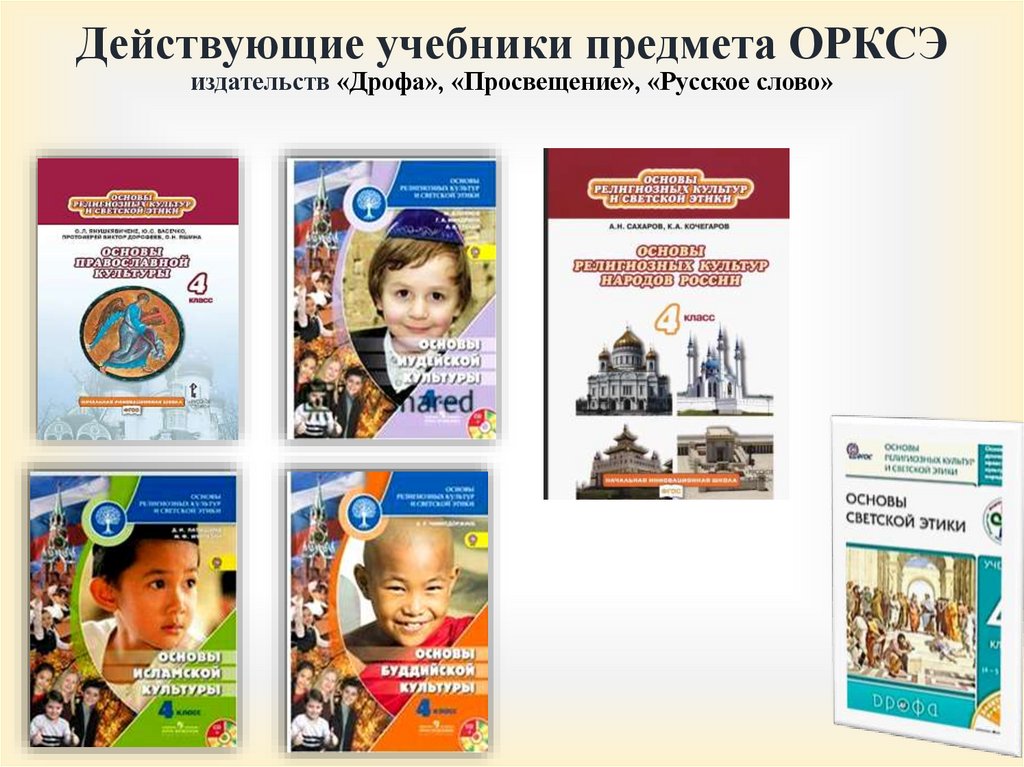 Действующие учебники предмета ОРКСЭиздательств «Дрофа», «Просвещение», «Русское слово»