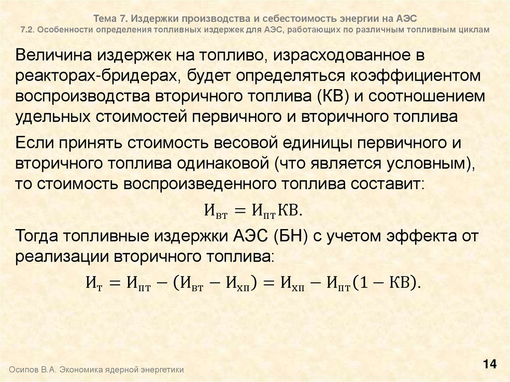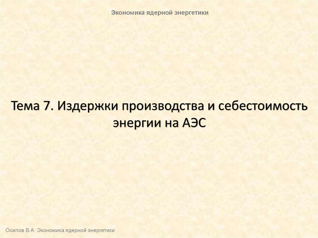 Экономика ядерной энергетикиТема 7. Издержки производства и себестоимость