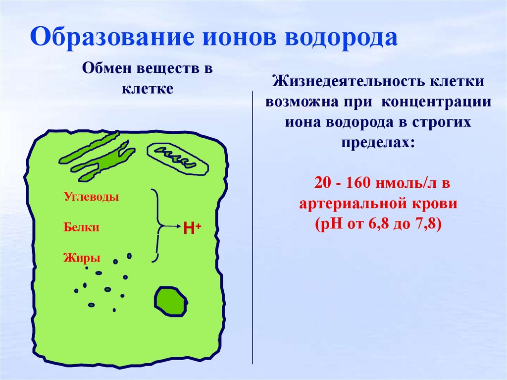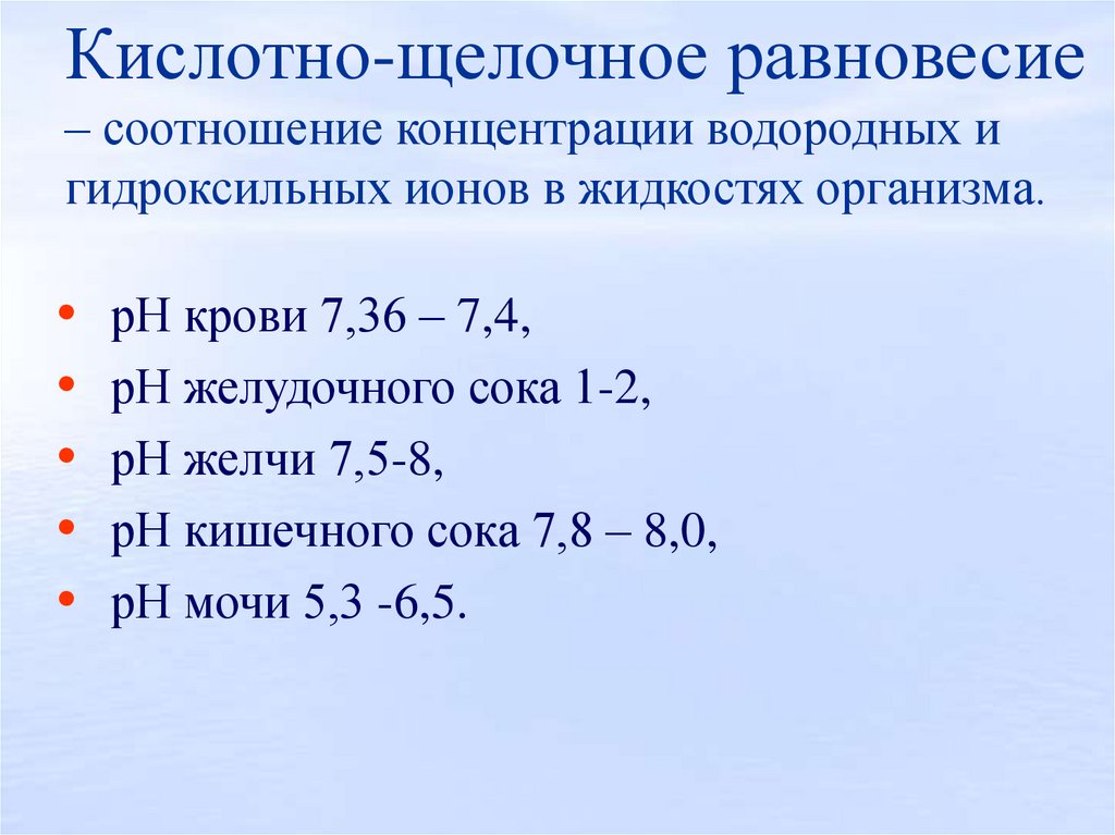 • рН крови 7,36 – 7,4,• рН желудочного сока 1-2,