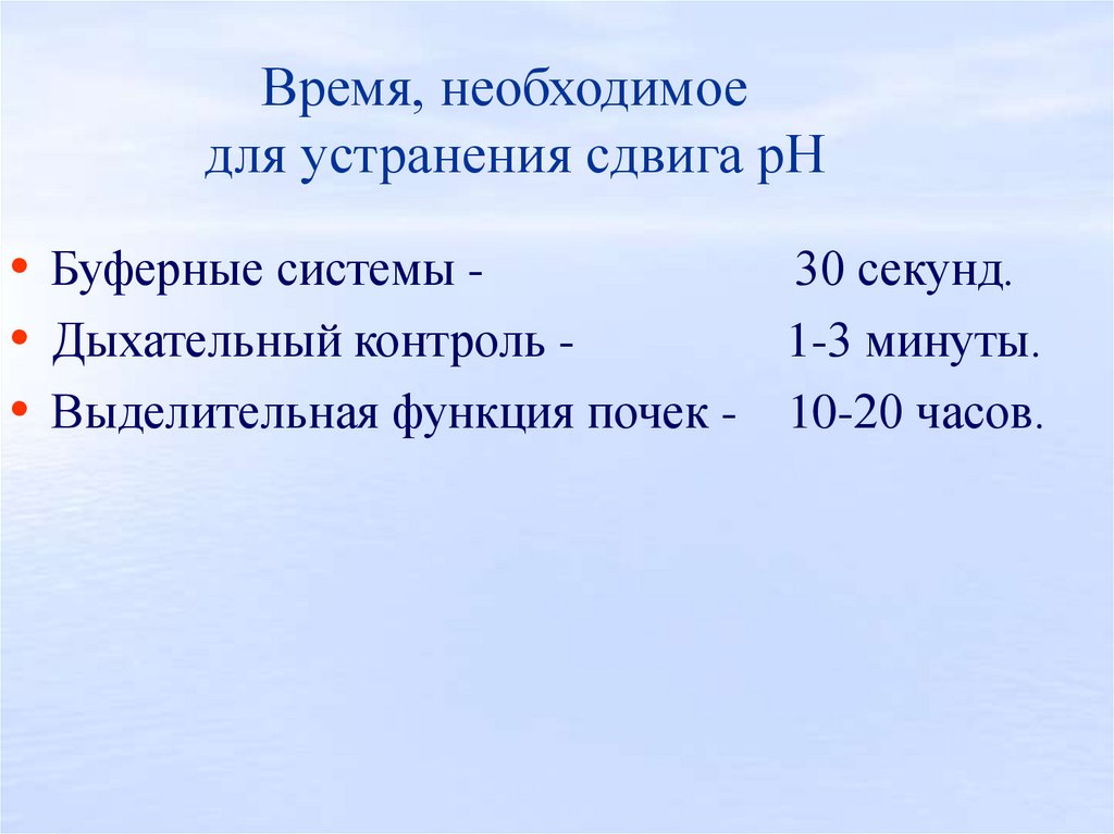 • Буферные системы 30 секунд.• Дыхательный контроль 1-3 минуты.