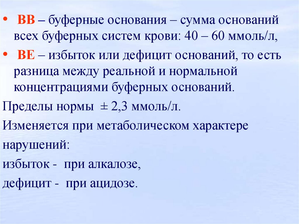 Избыток оснований (ВЕ)=Истинные ВВ- Нормальные ВВ
