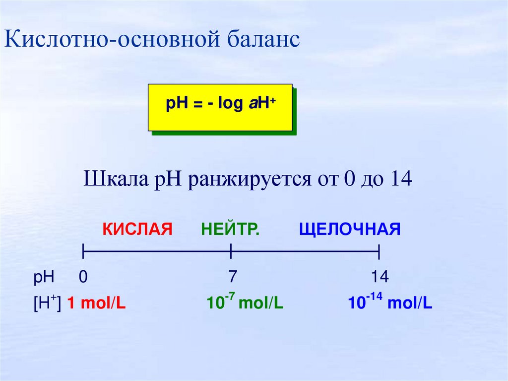 pH = - log aH+Шкала pH ранжируется от 0 до 14