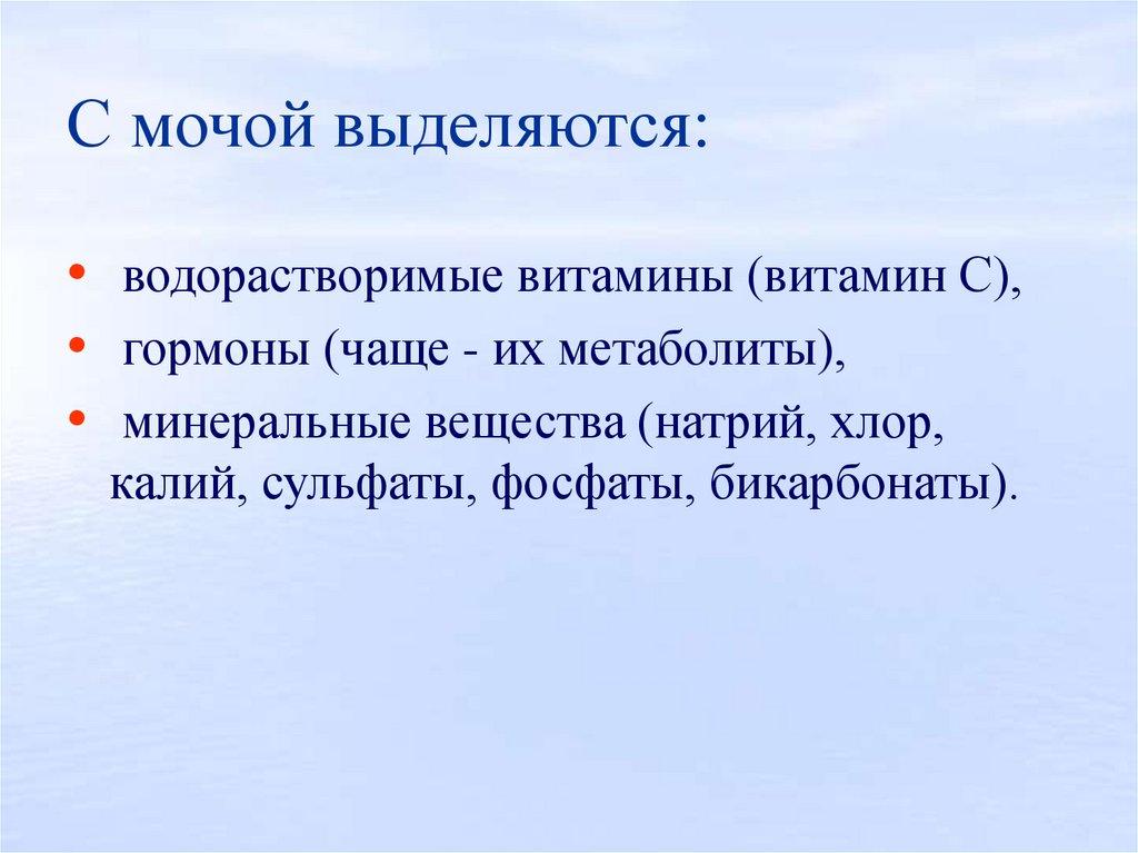 • водорастворимые витамины (витамин С),• гормоны (чаще - их метаболиты),