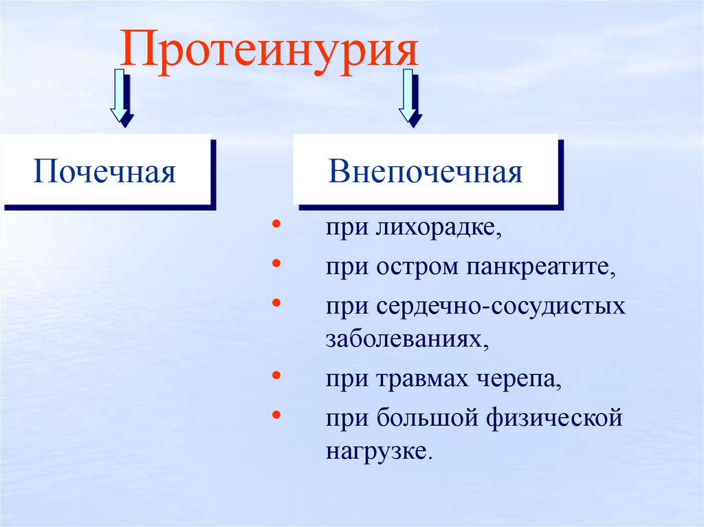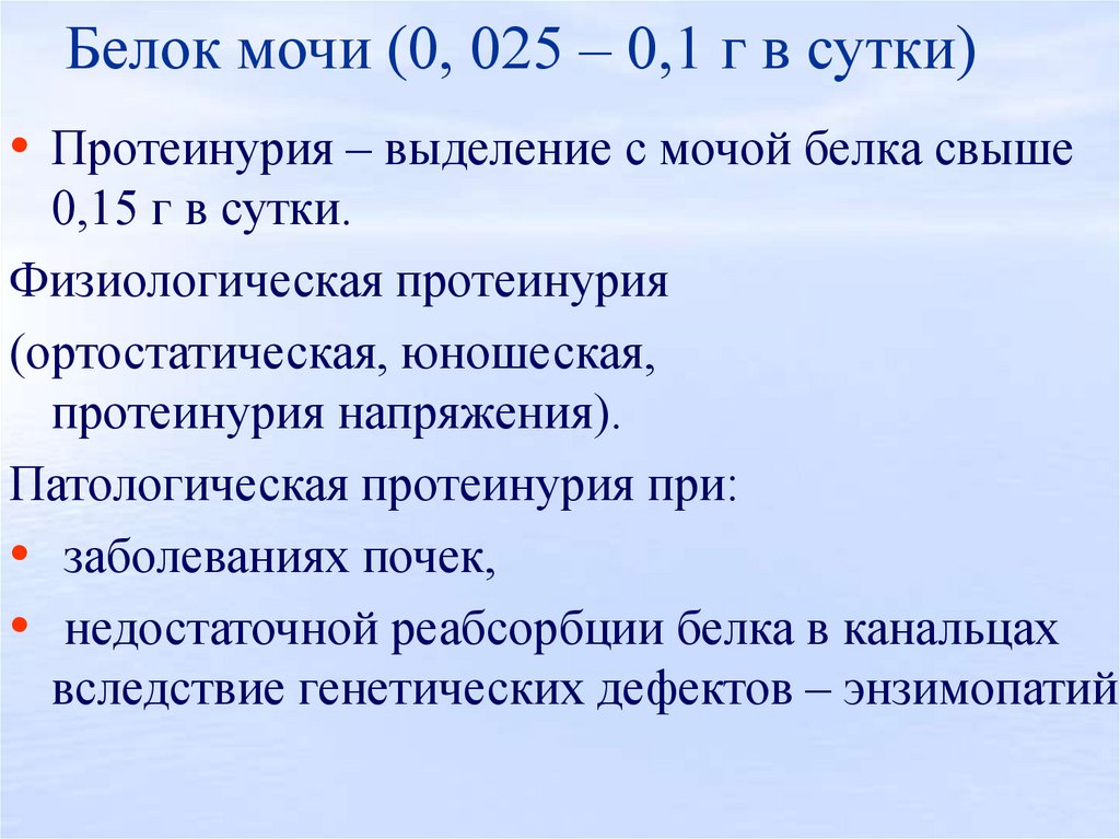 • Протеинурия – выделение с мочой белка свыше0,15 г в сутки.