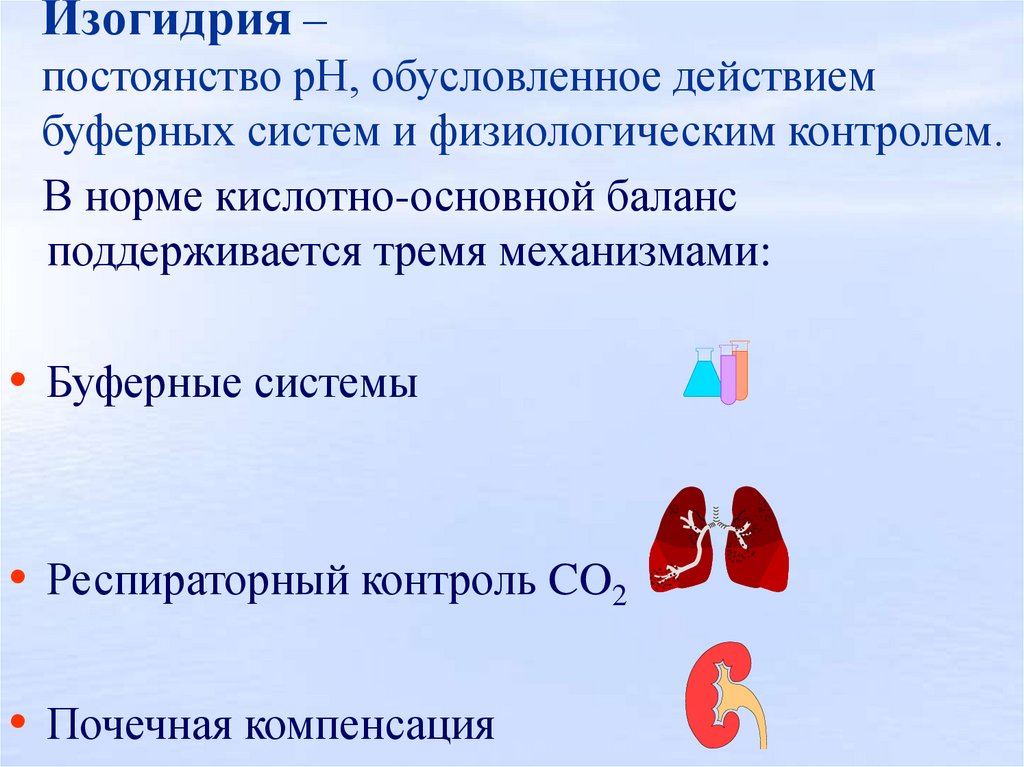 7. Изогидрия – постоянство рН, обусловленное действием буферных систем и физиологическим контролем.