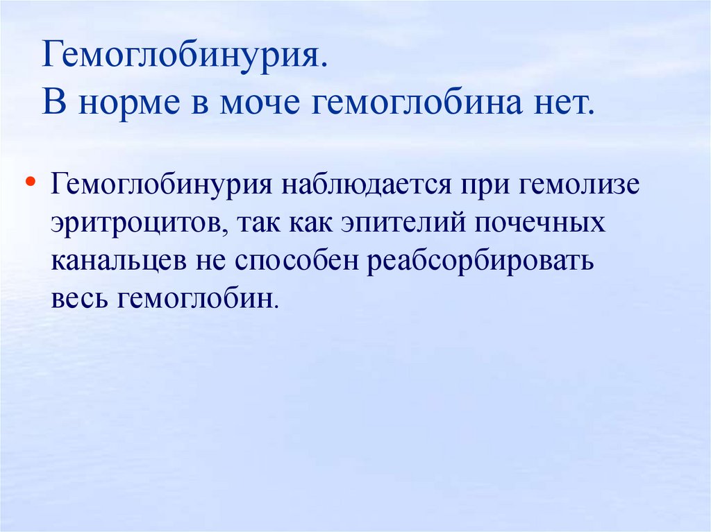 • Гемоглобинурия наблюдается при гемолизеэритроцитов, так как эпителий почечных