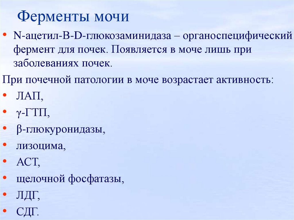 • N-ацетил-В-D-глюкозаминидаза – органоспецифическийфермент для почек. Появляется в моче лишь при