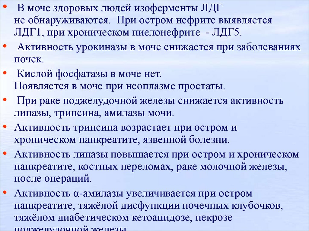• В моче здоровых людей изоферменты ЛДГне обнаруживаются. При остром нефрите выявляется