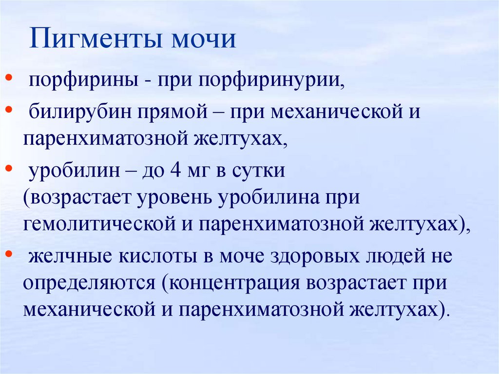 • порфирины - при порфиринурии,• билирубин прямой – при механической и