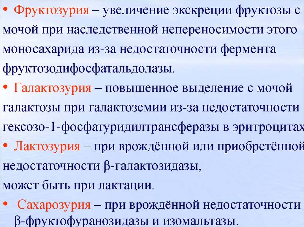• Фруктозурия – увеличение экскреции фруктозы смочой при наследственной непереносимости этого