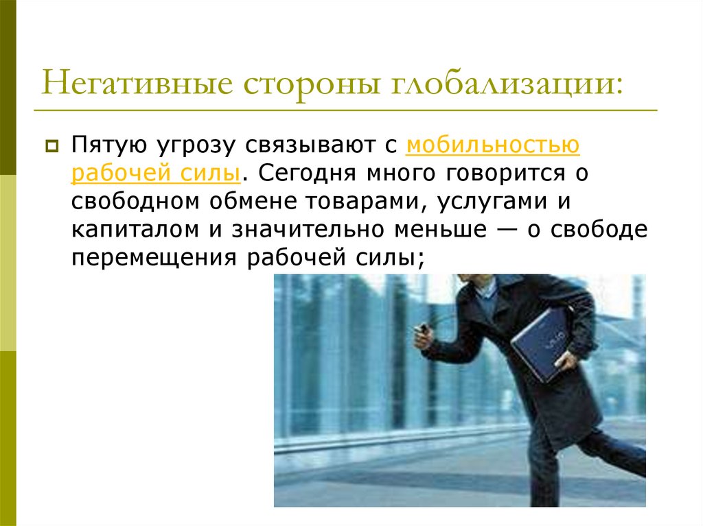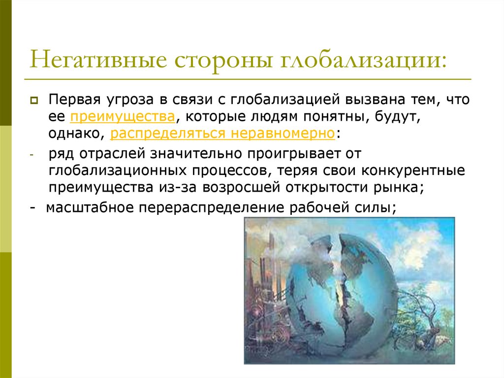 Первая угроза в связи с глобализацией вызвана тем, чтоее преимущества, которые людям понятны, будут,