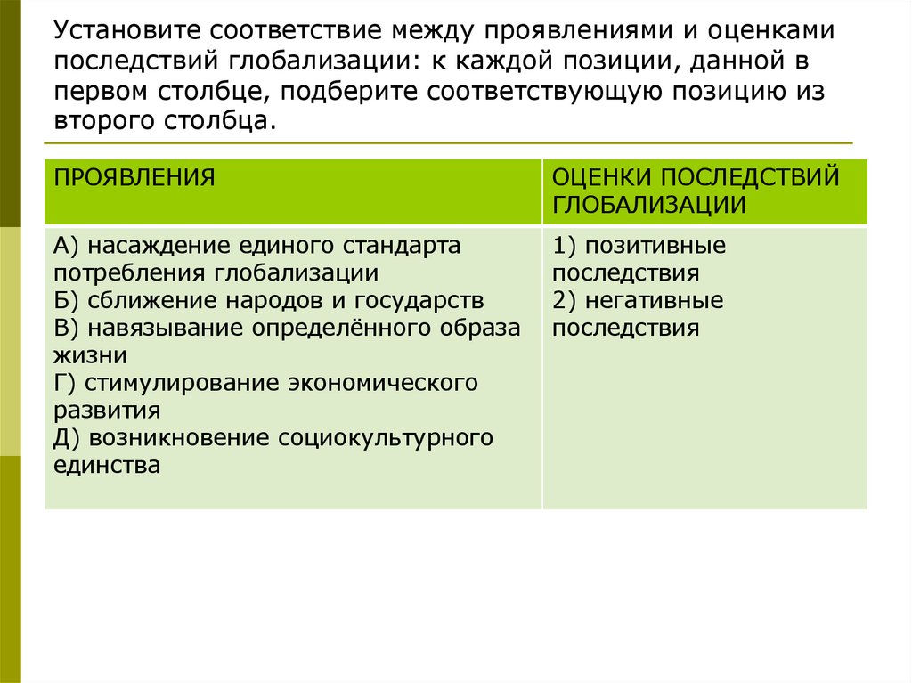 29. Установите соответствие между проявлениями и оценками последствий глобализации: к каждой позиции, данной в первом столбце,