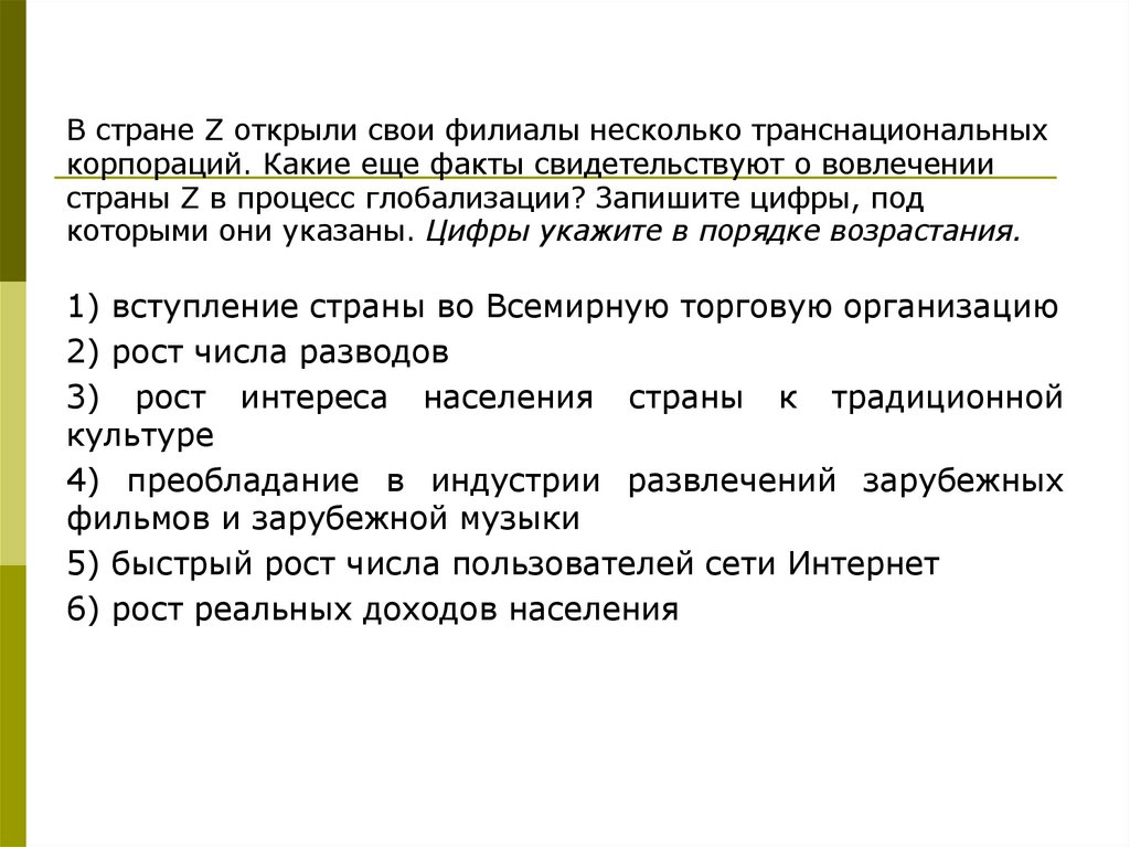 30. В стране Z открыли свои филиалы несколько транснациональных корпораций. Какие еще факты свидетельствуют о вовлечении страны Z в