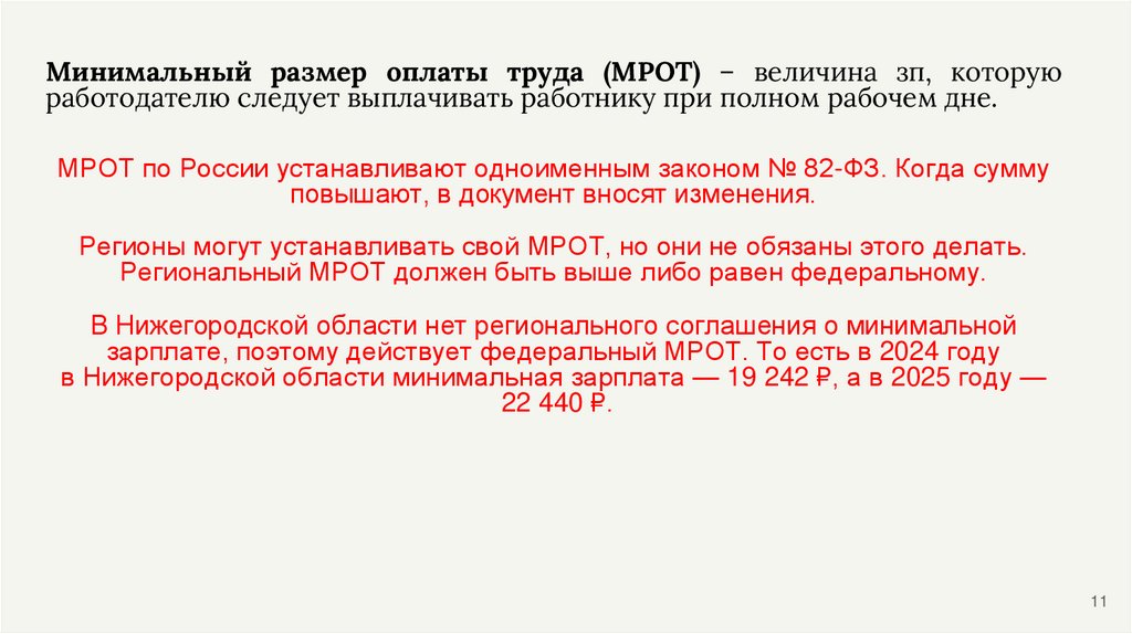 Минимальный размер оплаты труда (МРОТ) – величина зп, которуюработодателю следует выплачивать работнику при полном рабочем дне.