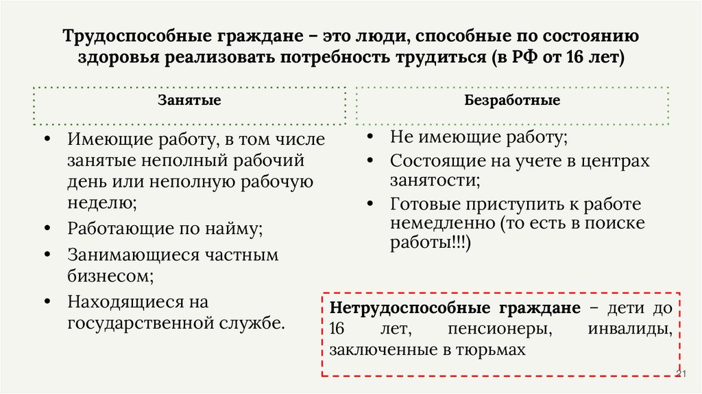 Трудоспособные граждане – это люди, способные по состояниюздоровья реализовать потребность трудиться (в РФ от 16 лет)