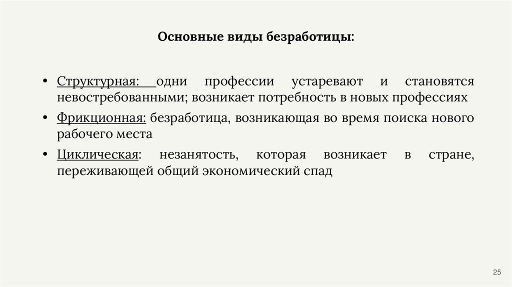 Основные виды безработицы:• Структурная: одни профессии устаревают и становятся