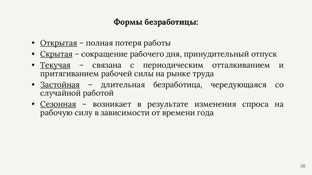 • Скрытая – сокращение рабочего дня, принудительный отпуск