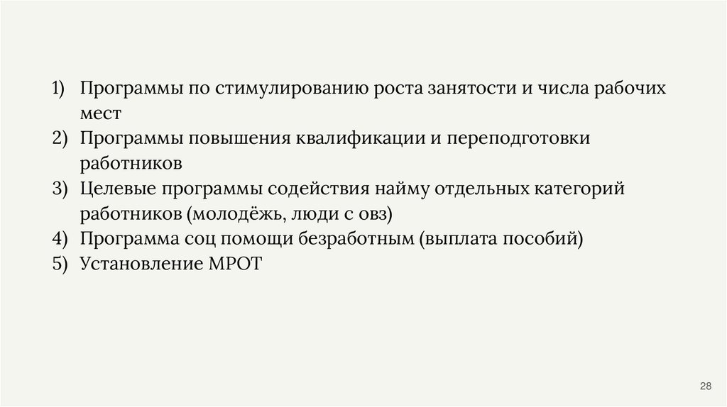 1) Программы по стимулированию роста занятости и числа рабочихмест