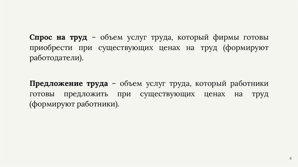 Спрос на труд – объем услуг труда, который фирмы готовыприобрести при существующих ценах на труд (формируют