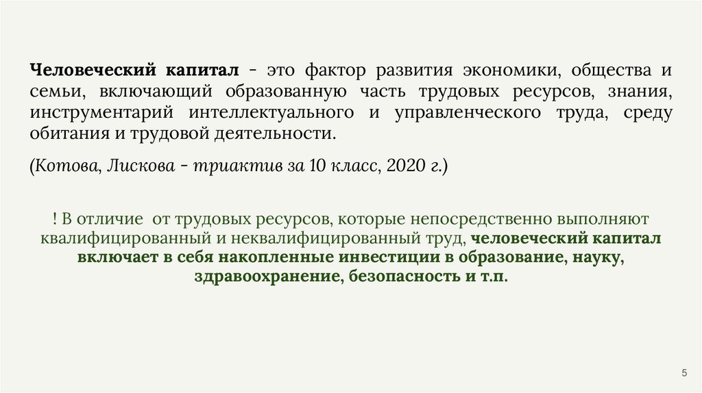 Человеческий капитал - это фактор развития экономики, общества исемьи, включающий образованную часть трудовых ресурсов, знания,