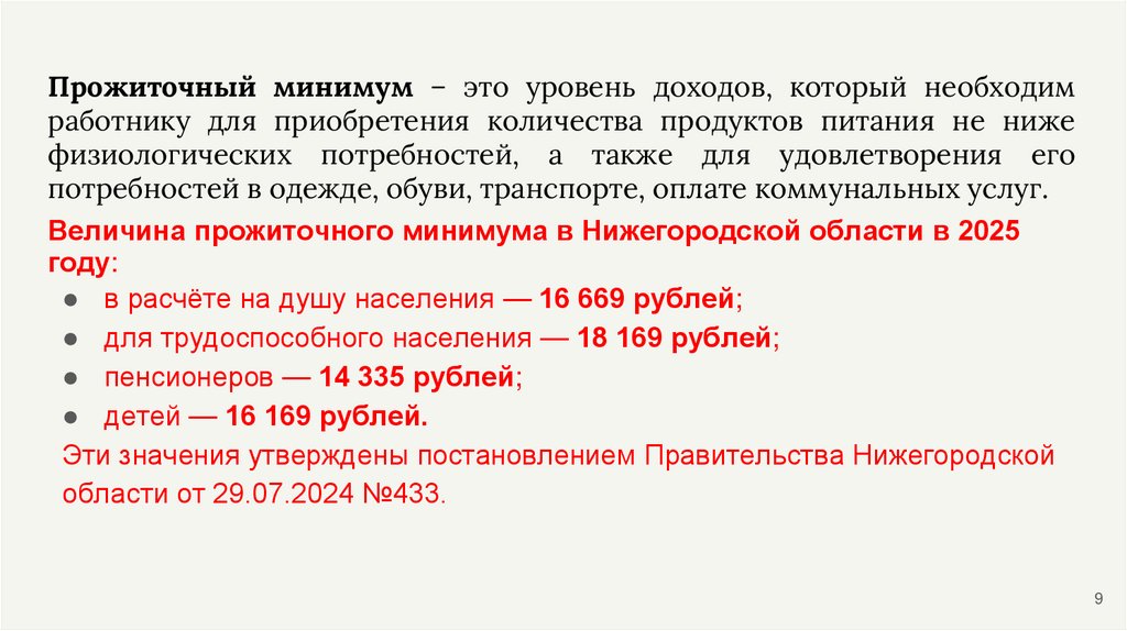 Прожиточный минимум – это уровень доходов, который необходимработнику для приобретения количества продуктов питания не ниже
