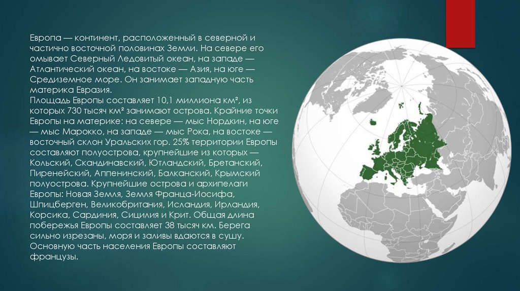 Европа — континент, расположенный в северной ичастично восточной половинах Земли. На севере его