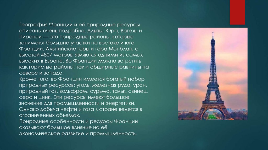 География Франции и её природные ресурсыописаны очень подробно. Альпы, Юра, Вогезы и