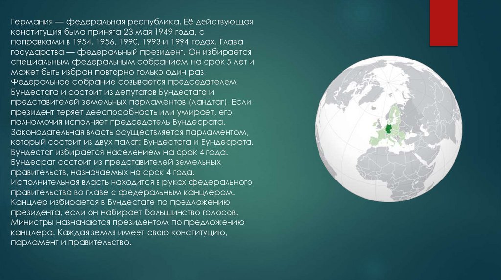 Германия — федеральная республика. Её действующаяконституция была принята 23 мая 1949 года, с