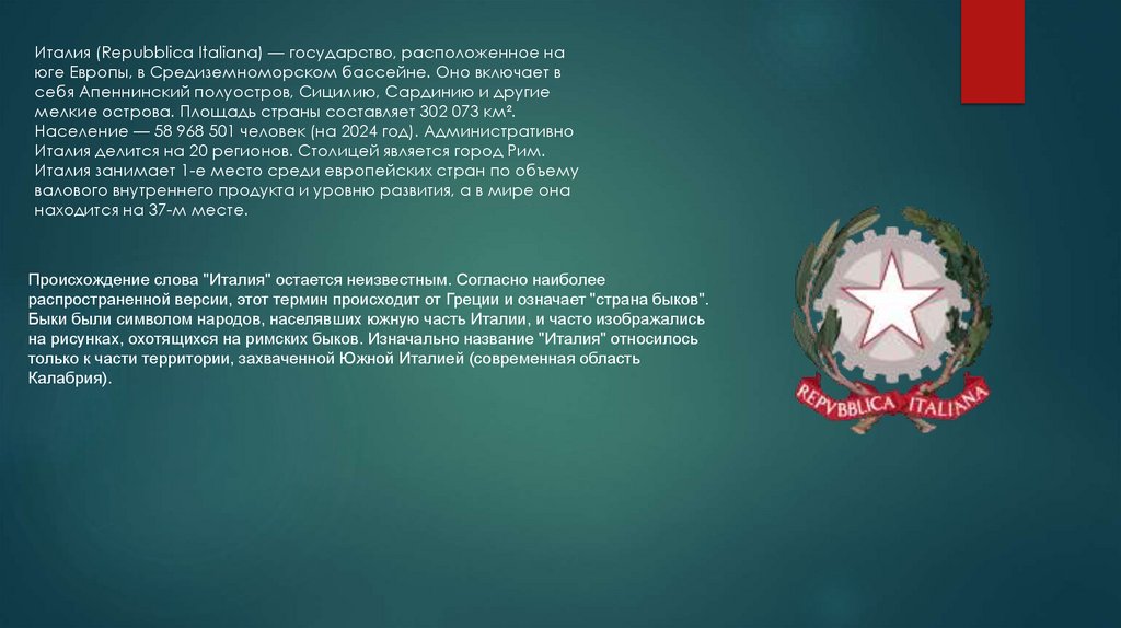 Италия (Repubblica Italiana) — государство, расположенное наюге Европы, в Средиземноморском бассейне. Оно включает в