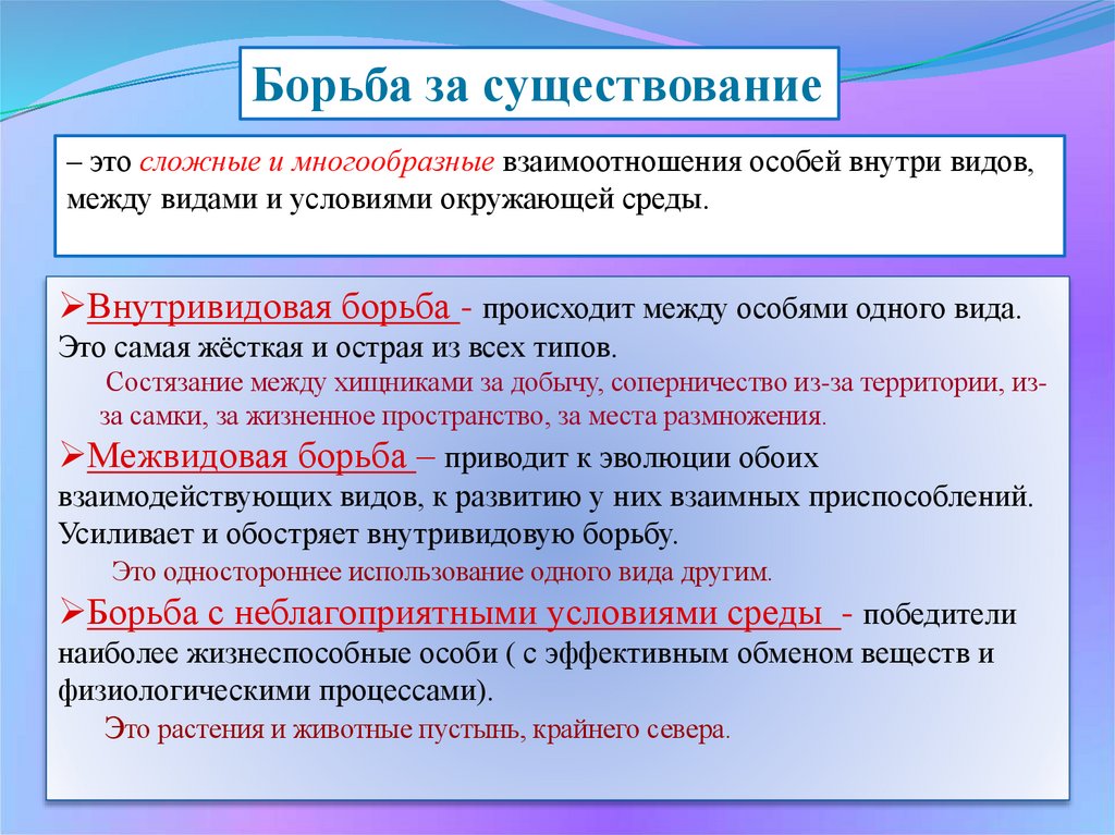 Борьба за существование– это сложные и многообразные взаимоотношения особей внутри видов,