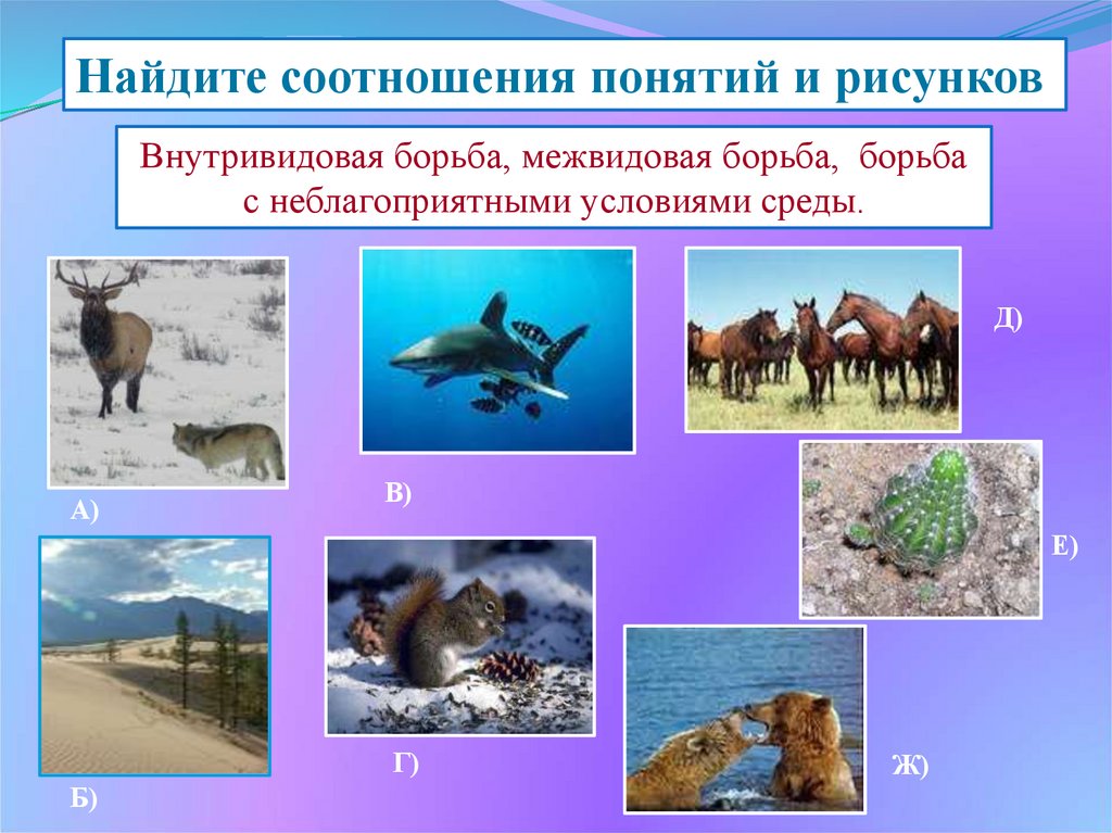 Найдите соотношения понятий и рисунковВнутривидовая борьба, межвидовая борьба, борьба