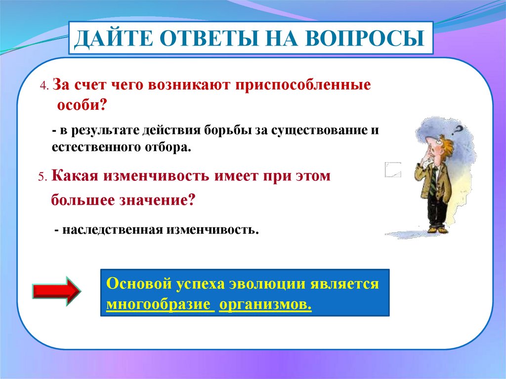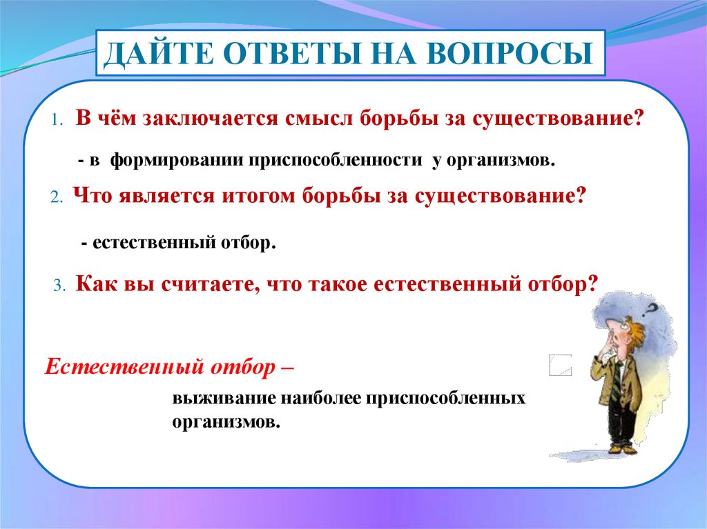 ДАЙТЕ ОТВЕТЫ НА ВОПРОСЫ1. В чём заключается смысл борьбы за существование?