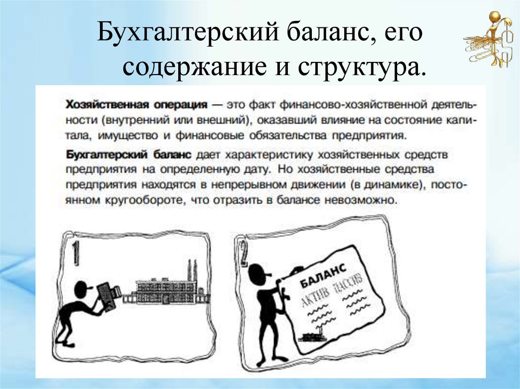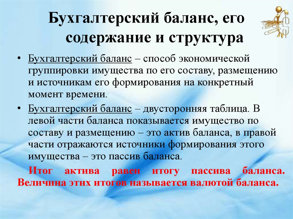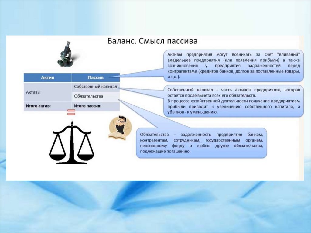 • Бухгалтерский баланс – двусторонняя таблица. В