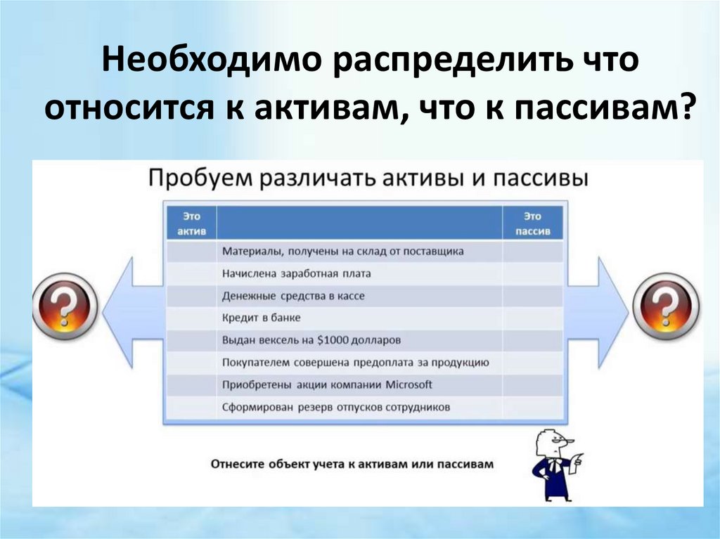 Необходимо распределить чтоотносится к активам, что к пассивам?