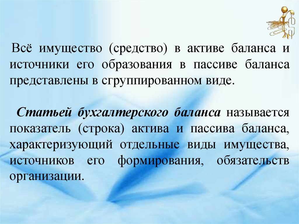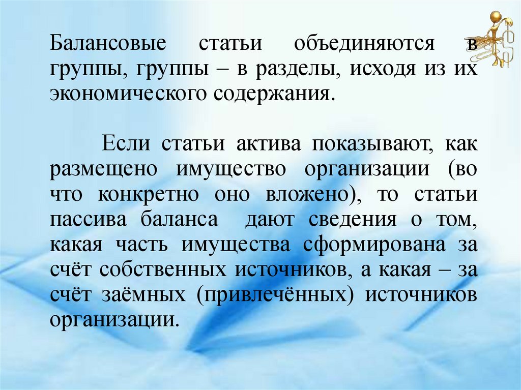 Балансовые статьи объединяются вгруппы, группы – в разделы, исходя из их