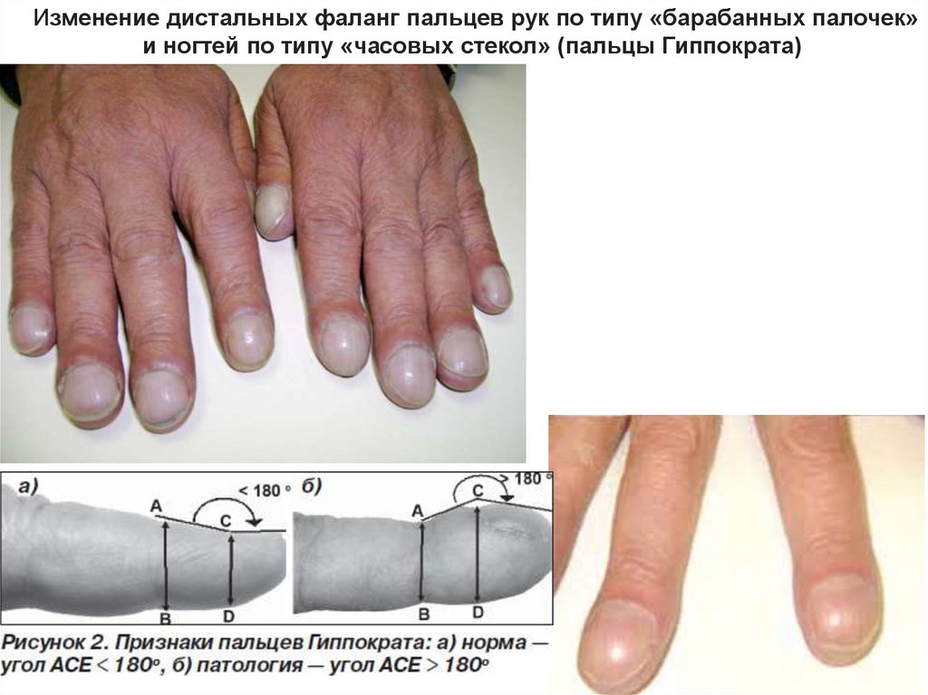 Изменение дистальных фаланг пальцев рук по типу «барабанных палочек»и ногтей по типу «часовых стекол» (пальцы Гиппократа)