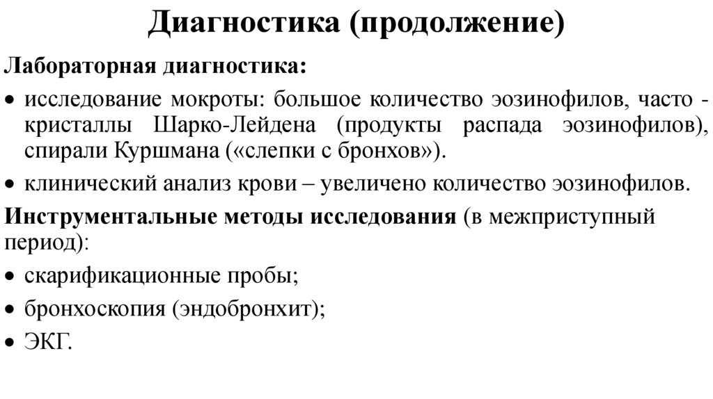 исследование мокроты: большое количество эозинофилов, часто кристаллы Шарко-Лейдена (продукты распада эозинофилов),