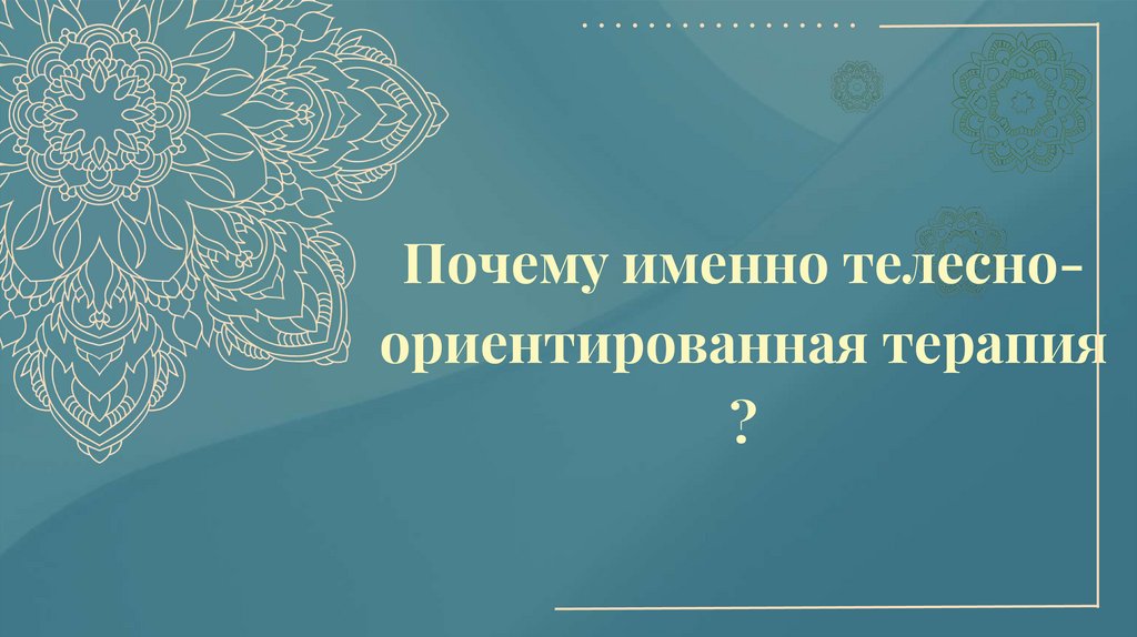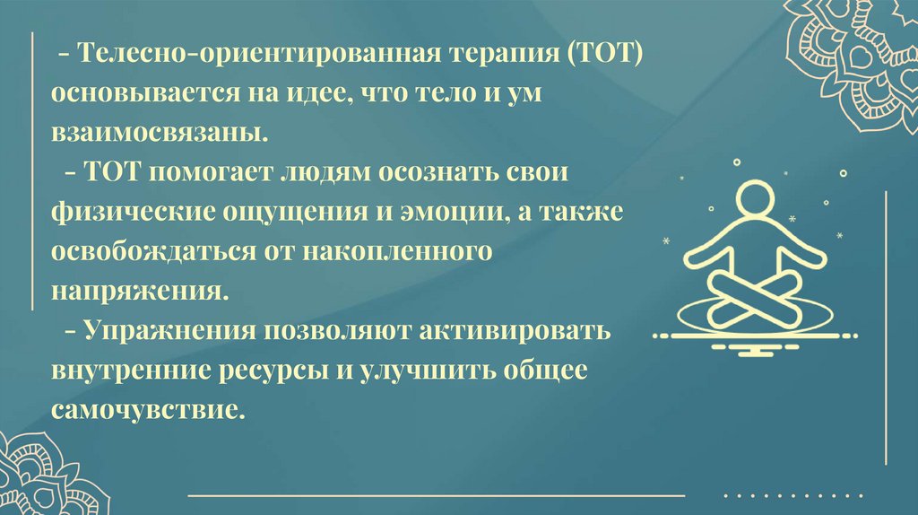 - Телесно-ориентированная терапия (ТОТ)основывается на идее, что тело и ум
