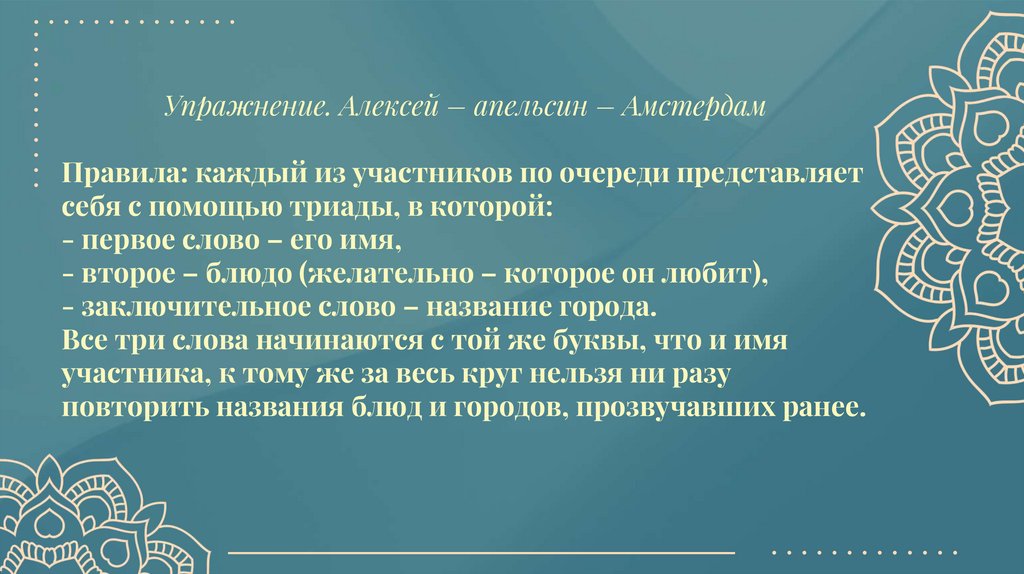 Упражнение. Алексей – апельсин – АмстердамПравила: каждый из участников по очереди представляет