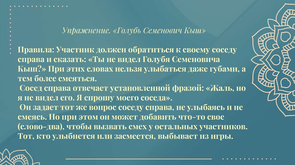 Упражнение. «Голубь Семенович Кыш»Правила: Участник должен обратиться к своему соседу