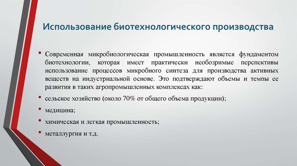 Использование биотехнологического производства• Современная микробиологическая промышленность является фундаментом