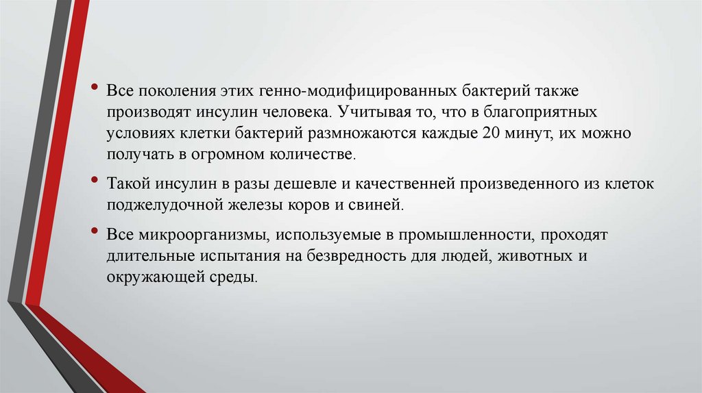 • Все поколения этих генно-модифицированных бактерий такжепроизводят инсулин человека. Учитывая то, что в благоприятных