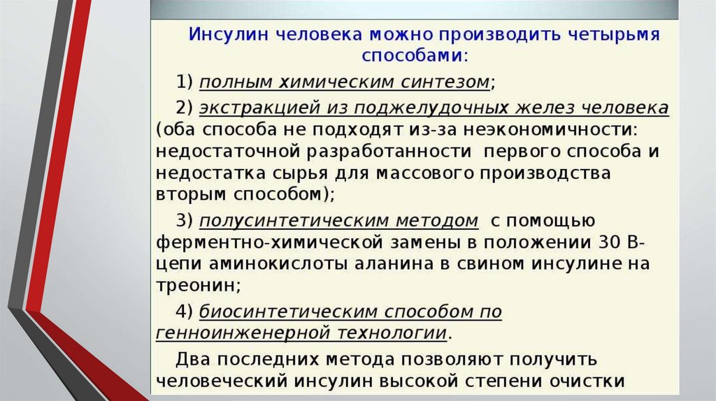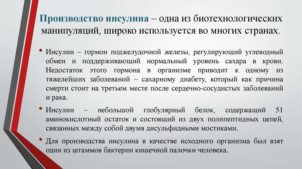 Производство инсулина – одна из биотехнологическихманипуляций, широко используется во многих странах.
