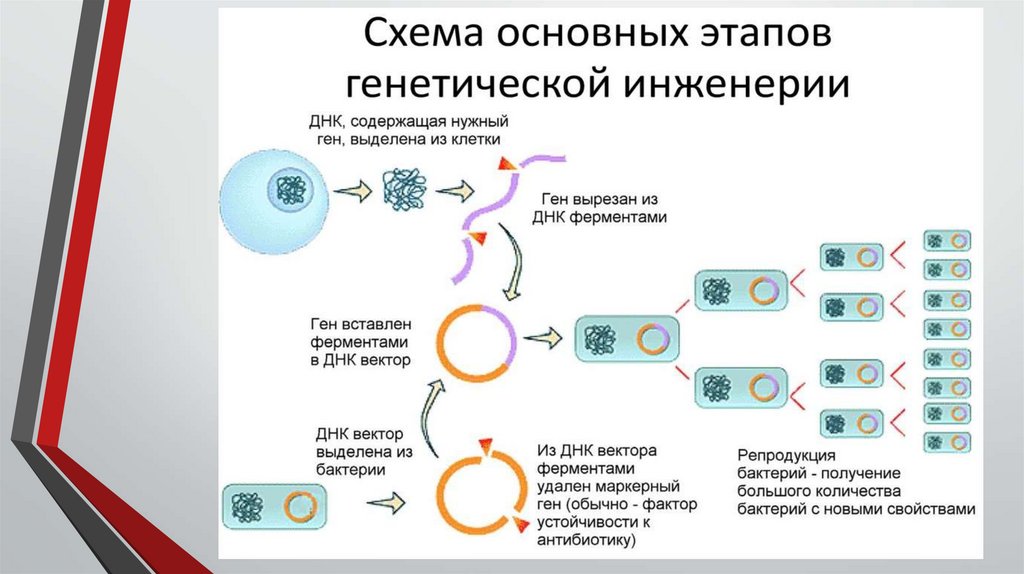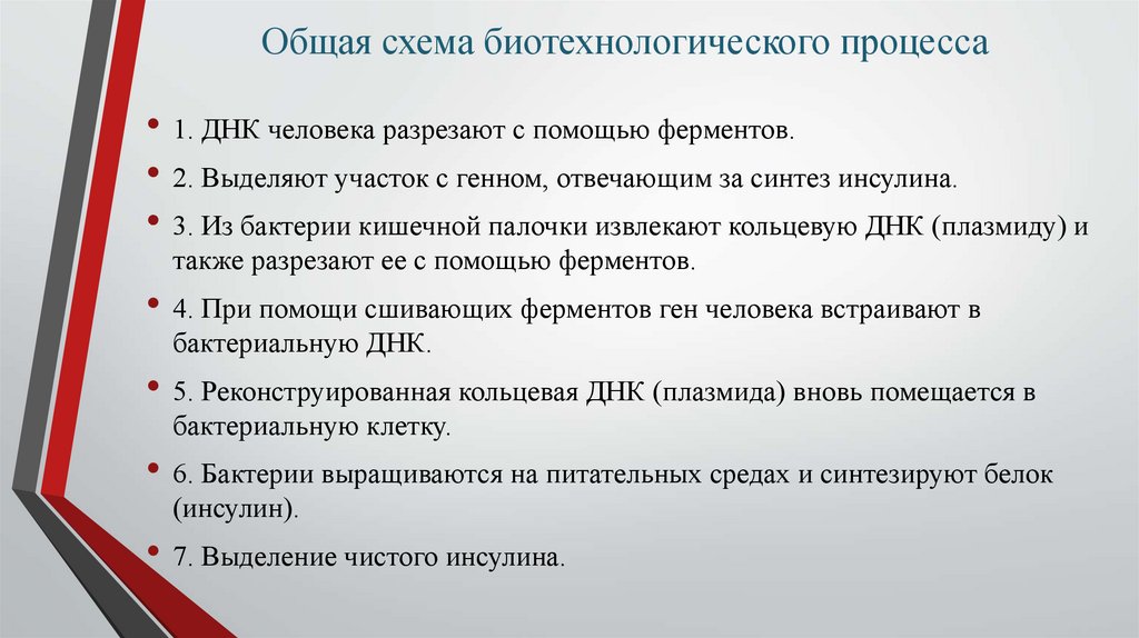 Общая схема биотехнологического процесса• 1. ДНК человека разрезают с помощью ферментов.
