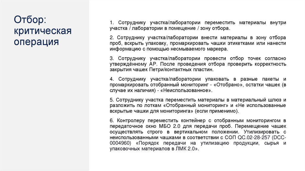 2. Сотруднику участка/лаборатории внести материалы в зону отбора