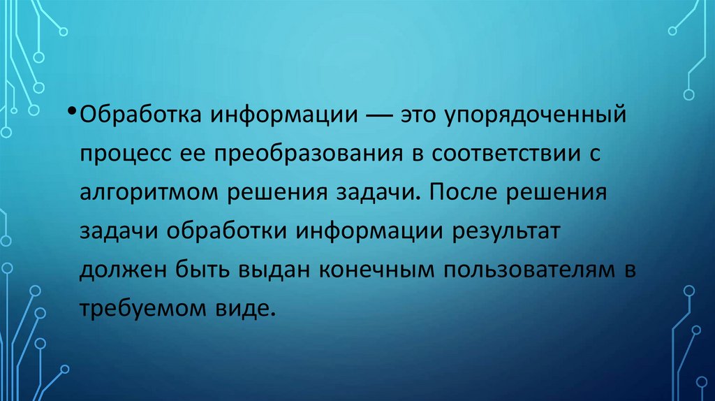 • Обработка информации — это упорядоченныйпроцесс ее преобразования в соответствии с