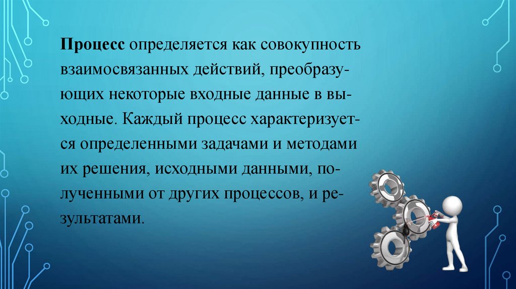 Процесс определяется как совокупностьвзаимосвязанных действий, преобразующих некоторые входные данные в выходные. Каждый процесс характеризуется определенными задачами и методами