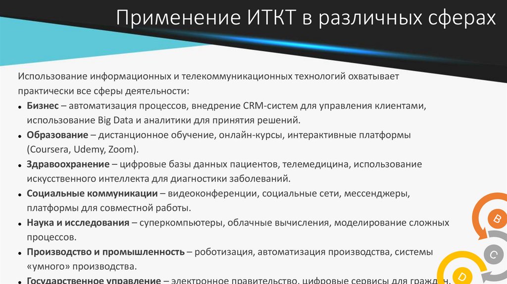 Применение ИТКТ в различных сферахИспользование информационных и телекоммуникационных технологий охватывает