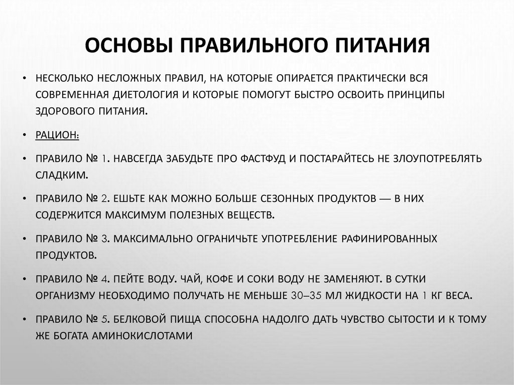 ОСНОВЫ ПРАВИЛЬНОГО ПИТАНИЯ• НЕСКОЛЬКО НЕСЛОЖНЫХ ПРАВИЛ, НА КОТОРЫЕ ОПИРАЕТСЯ ПРАКТИЧЕСКИ ВСЯ
