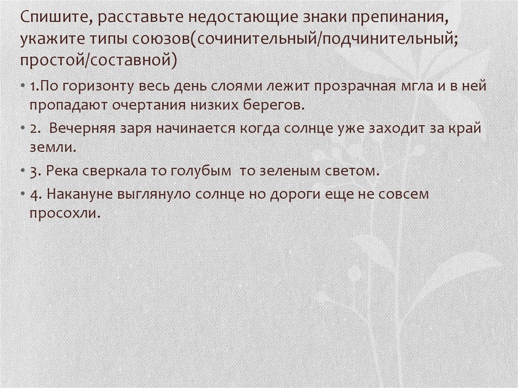 Спишите, расставьте недостающие знаки препинания,укажите типы союзов(сочинительный/подчинительный;